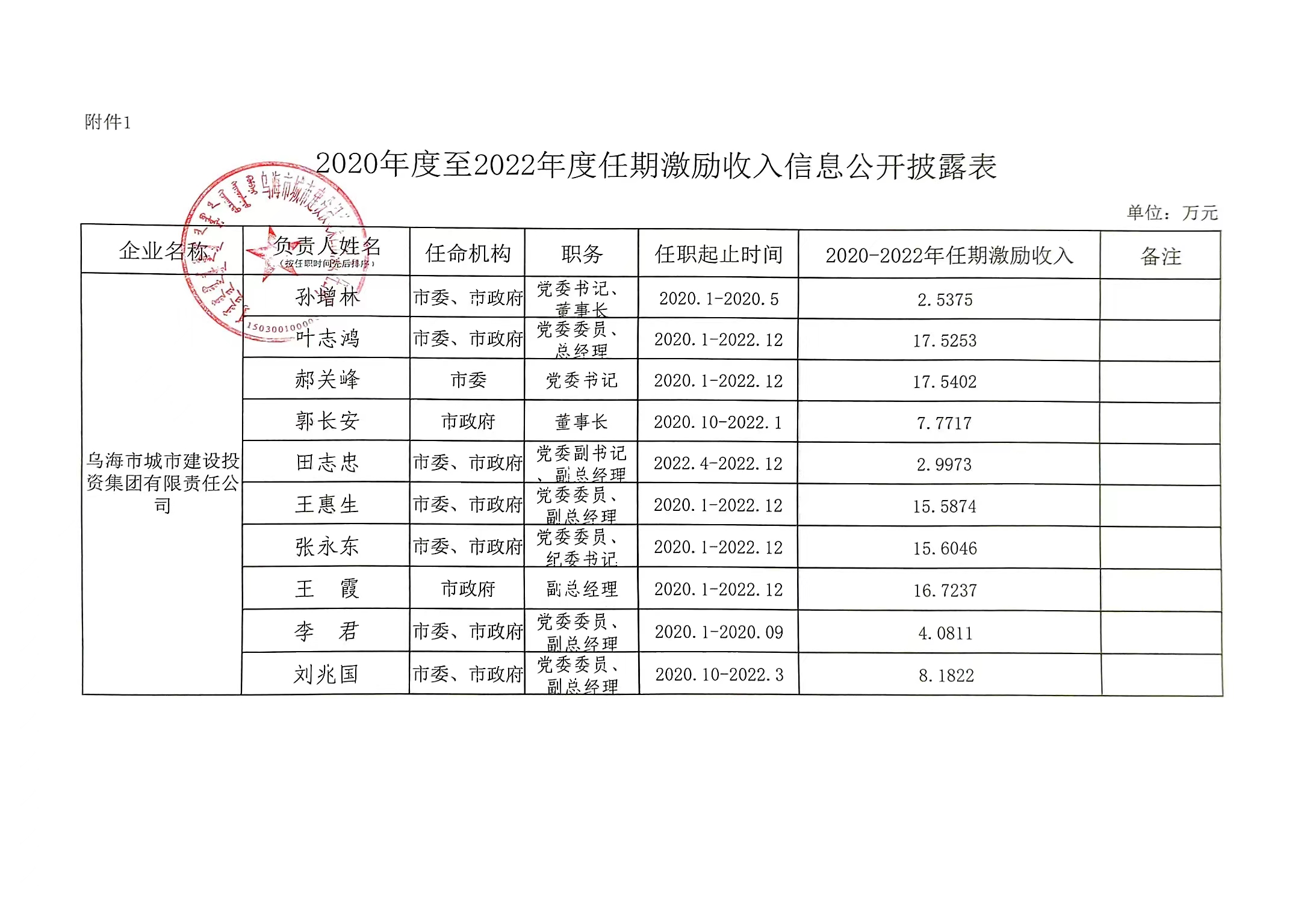 烏海市城市建設(shè)投資集團(tuán)有限責(zé)任公司企業(yè)負(fù)責(zé)人2020年度至2022年度任期激收入信息公開披露表